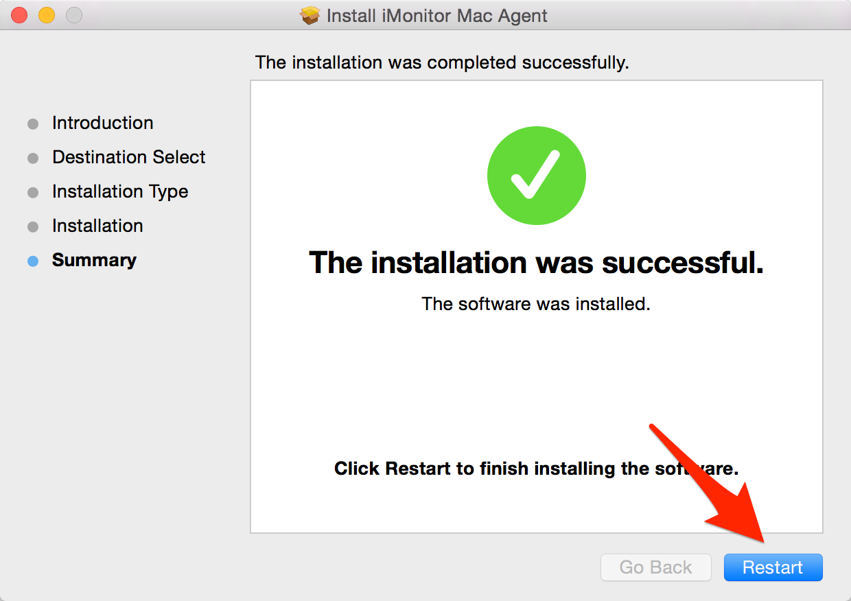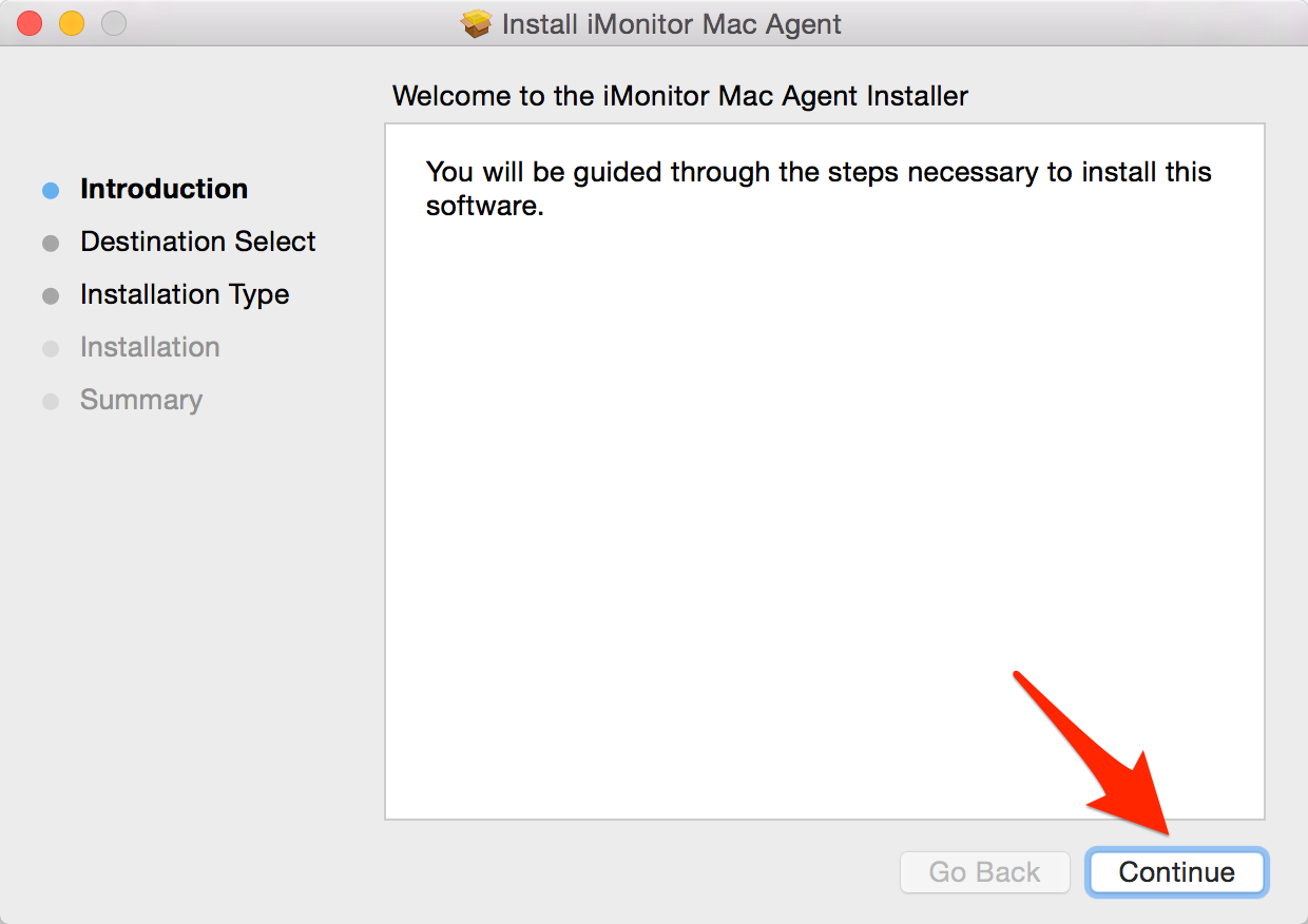 「imonitor-mac-agent.pkg」をエージェントPCのローカルにコピーし、実行してください、「次へ」をクリックしてください。