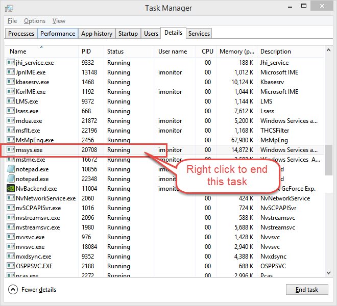 5. After that, please reinstall the agent program, and open “Task Manager” to see if the “mssys.exe” is running or not, if it is running, please end task and wait one second, the process will run automatically. If not, please re-set the anti-virus once again.