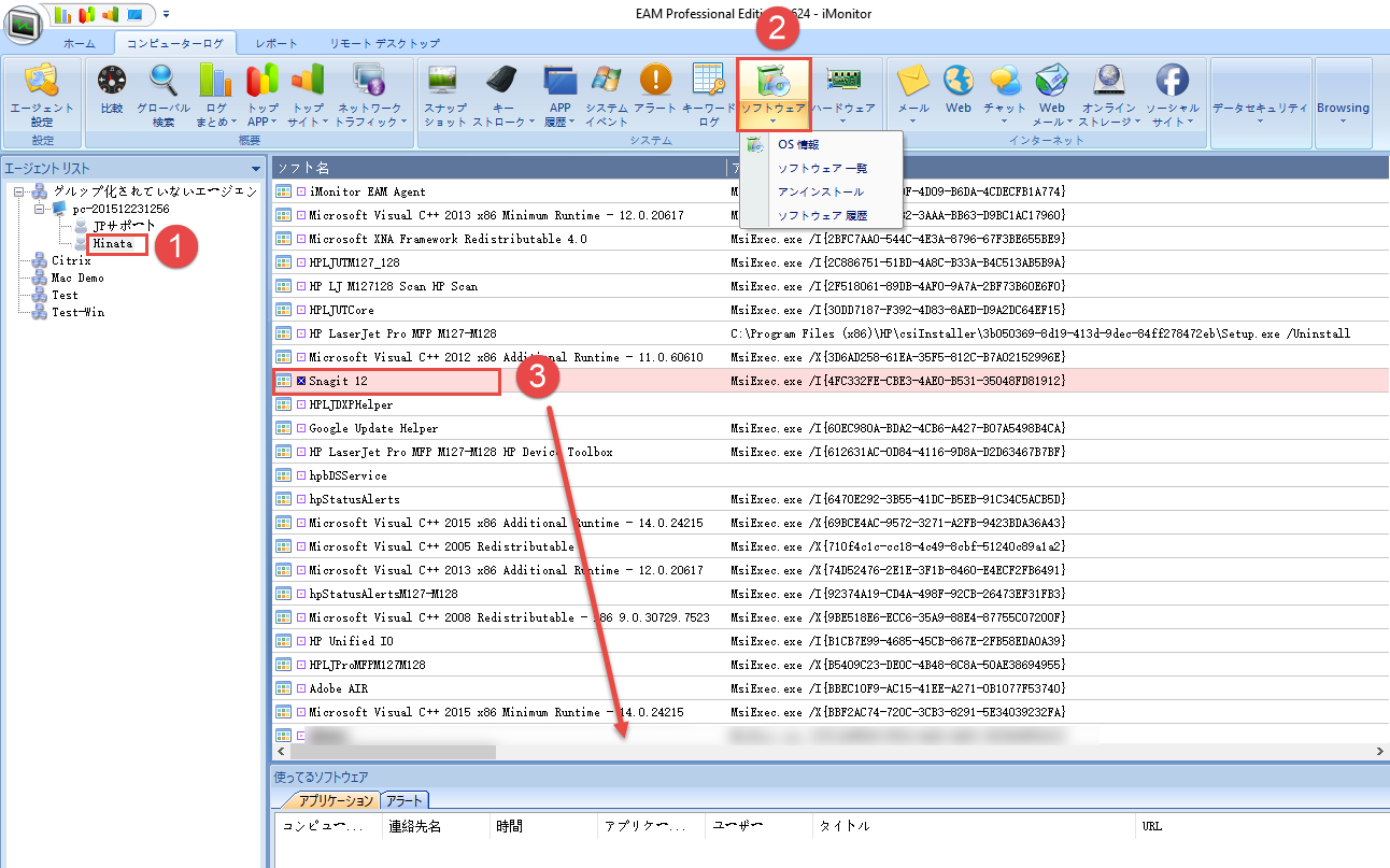 2.「コンピューターログ」→「ソフトウェア」のプールダウンリストのボタンをクリックしてください、ソフトウェアが表示されます。